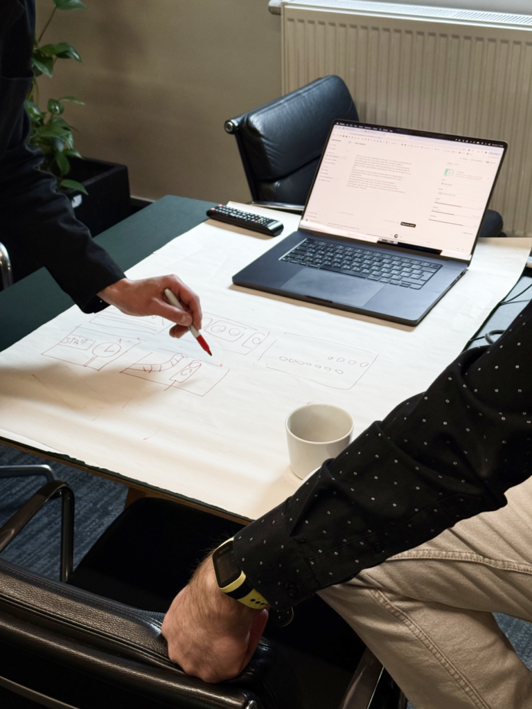 Vi begynte med å formulere målet for kunden på tvers av avdelinger og skape en felles forståelse av oppgaven. Fasen besto av analyse av eksisterende materiell og intervjuer av ansatte for å kartlegge muligheter og utfordringer.