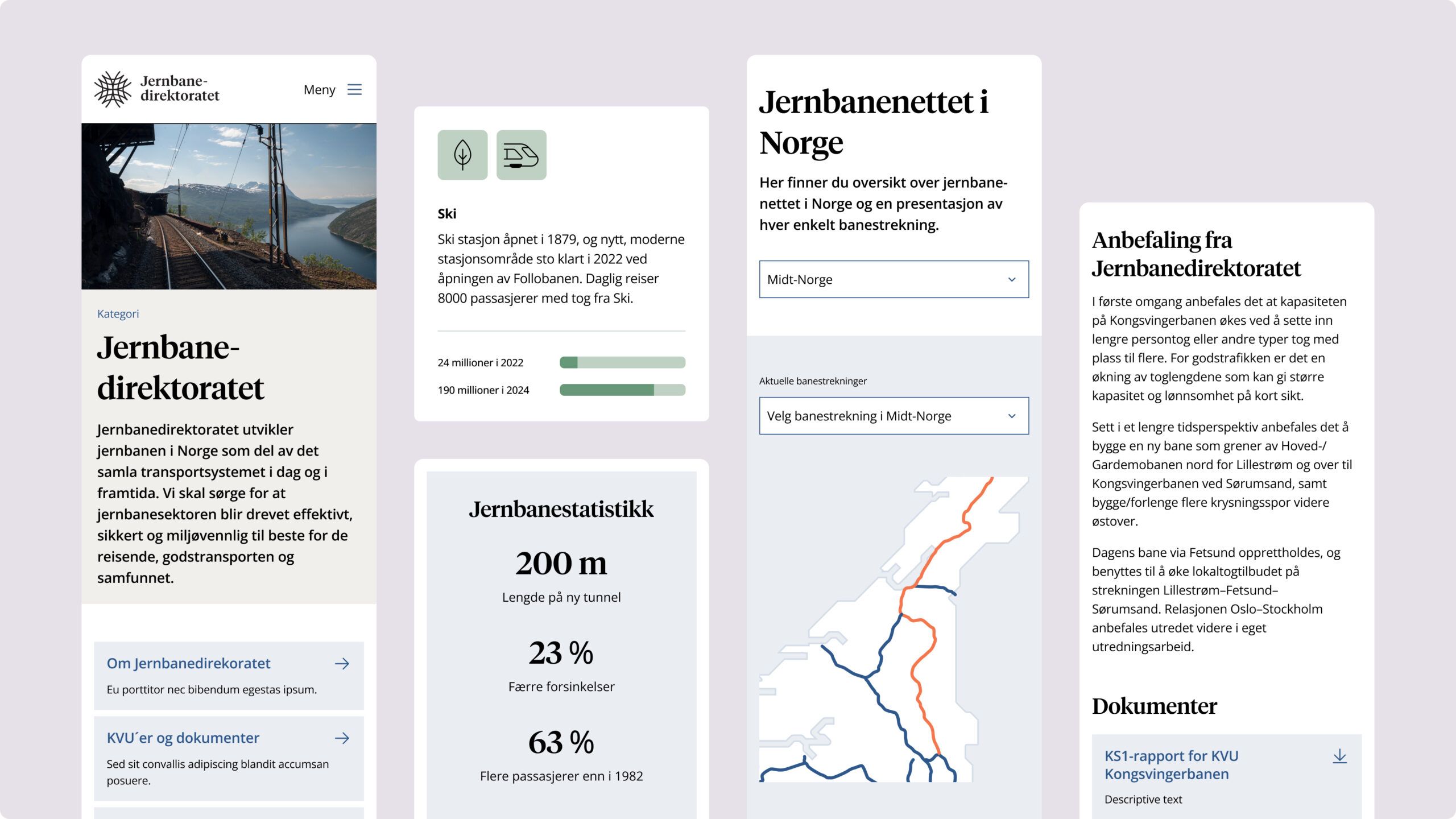 Enkelte visuelle forskjeller er ivaretatt (særlig for Lokførerskolen), samtidig som de fleste sidene har en tydelig felles rød tråd. Jernbanedirektoratet har dessuten fått utviklet en komplett stilguide, og en verktøykasse med designelementer for å sikre et helhetlig uttrykk for presentasjoner og infografikk i fremtiden.