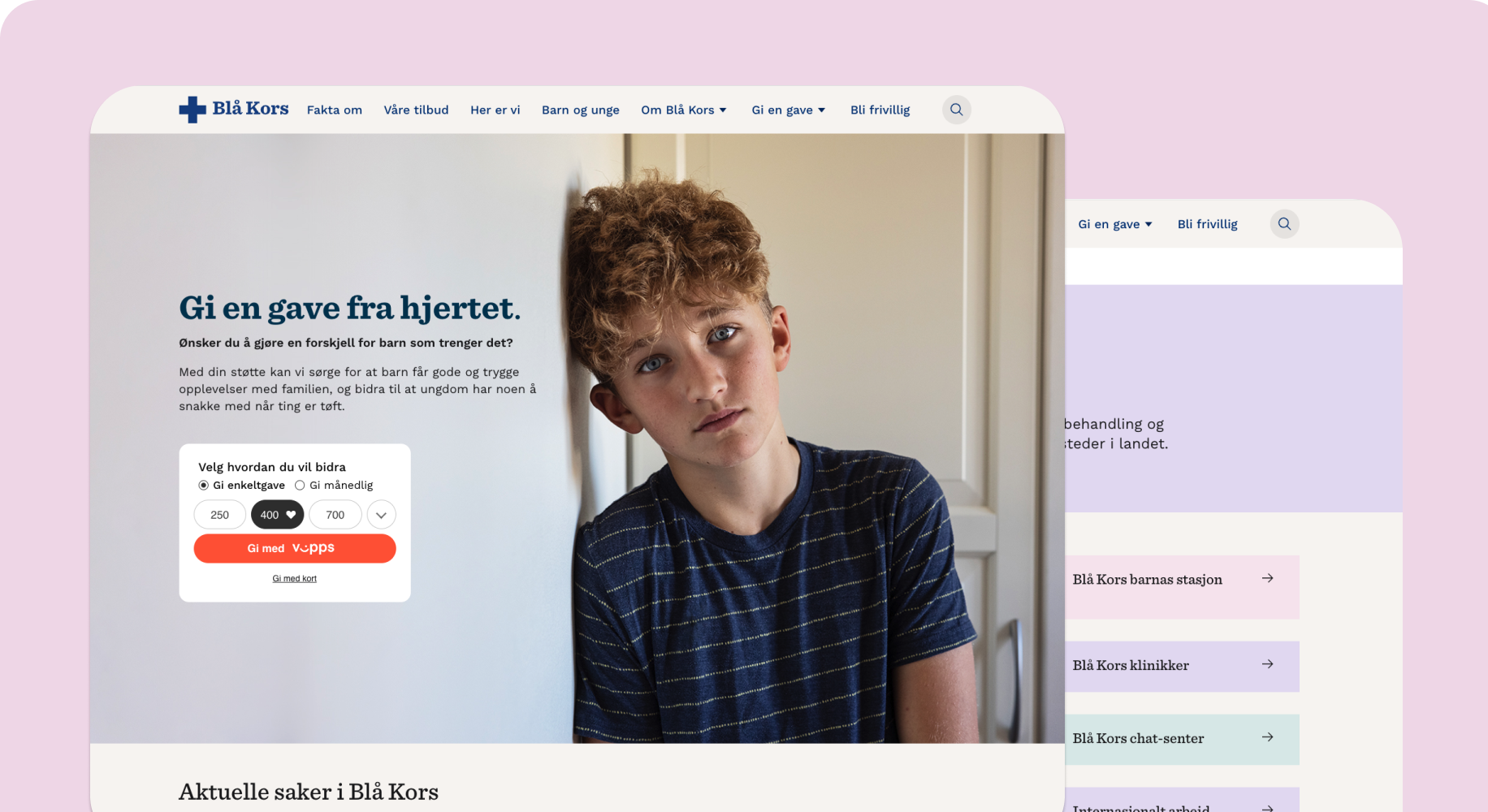 Nettsiden ble relansert med Blå Kors sitt nye brand i 2022. Det ble gjort på en kostnadseffektiv måte da nettsiden deres er bygd opp av moduler som kan stiles om uten at strukturer eller eksisterende innhold må lages eller organiseres på nytt.